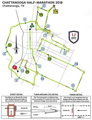 Start in front of High Point Climbing on Broad Street. Run down Broad to MLK, over to Market, Down to 20th/Riverfront Parkway, around and through Ross’s Landing and then up to Battery Place area. From there, take the cut through to Veterans Bridge and over the river, then down to Frazier, back across the Walnut Street Bridge, shoot over to UTC on 3rd, run through Campus, take MLK/Bailey out to the National Cemetery, around that and then Main Street back towards Finley Stadium. Just before the finish line, the marathon will split from the half course and do that loop again.